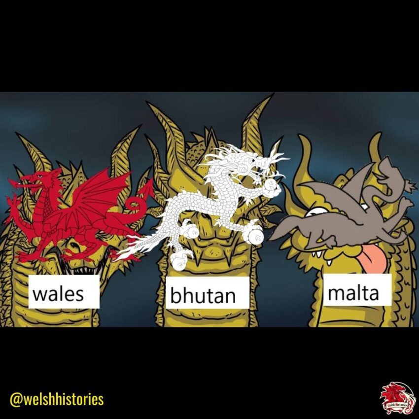 Cymru, Bhutan and Malta each have a dragon… although the Maltese dragon is getting trampled by St George and his horse in their flag, so it barely counts. Take care of your dragon!
